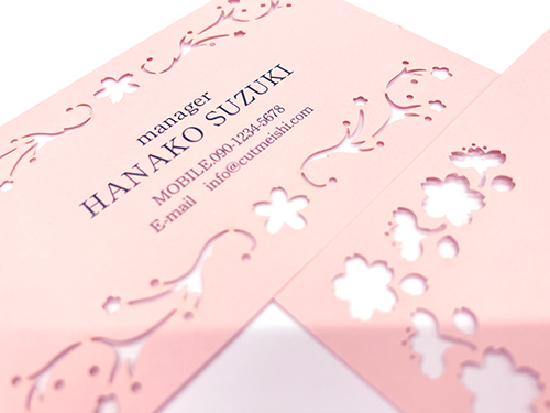 レーザーカットで切り抜いた桜は、印刷だけでは出せない立体感と上品さがあり、控えめでありながら印象に残るご挨拶ができます。はじめましての場面を彩る、新しい出会いの季節にふさわしい一枚です。